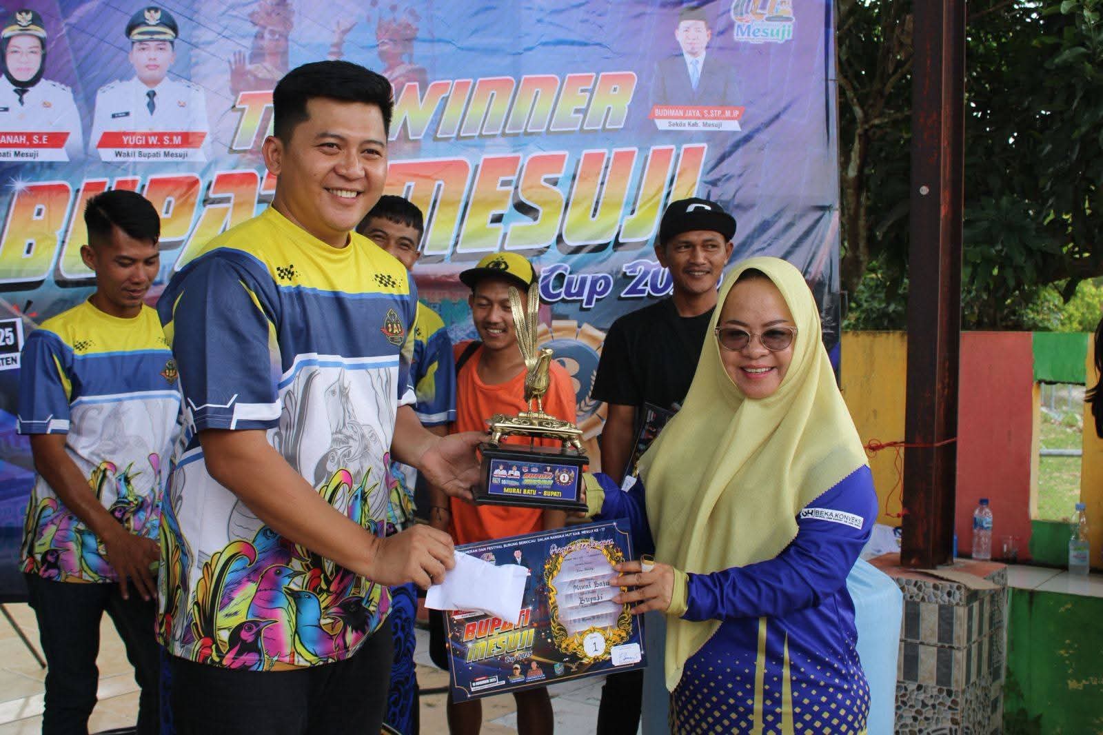 Bupati Mesuji Hj. Elfianah didampingi Wakil Bupati Mesuji M. Yugi Wicaksono serta Sekretaris Daerah Kabupaten Mesuji Budiman Jaya menghadiri Lomba Burung Berkicau yang digelar dalam rangka memeriahkan Hari Ulang Tahun (HUT) ke-17 Kabupaten Mesuji, bertempat di Taman Kehati, Minggu (16/11/2025).